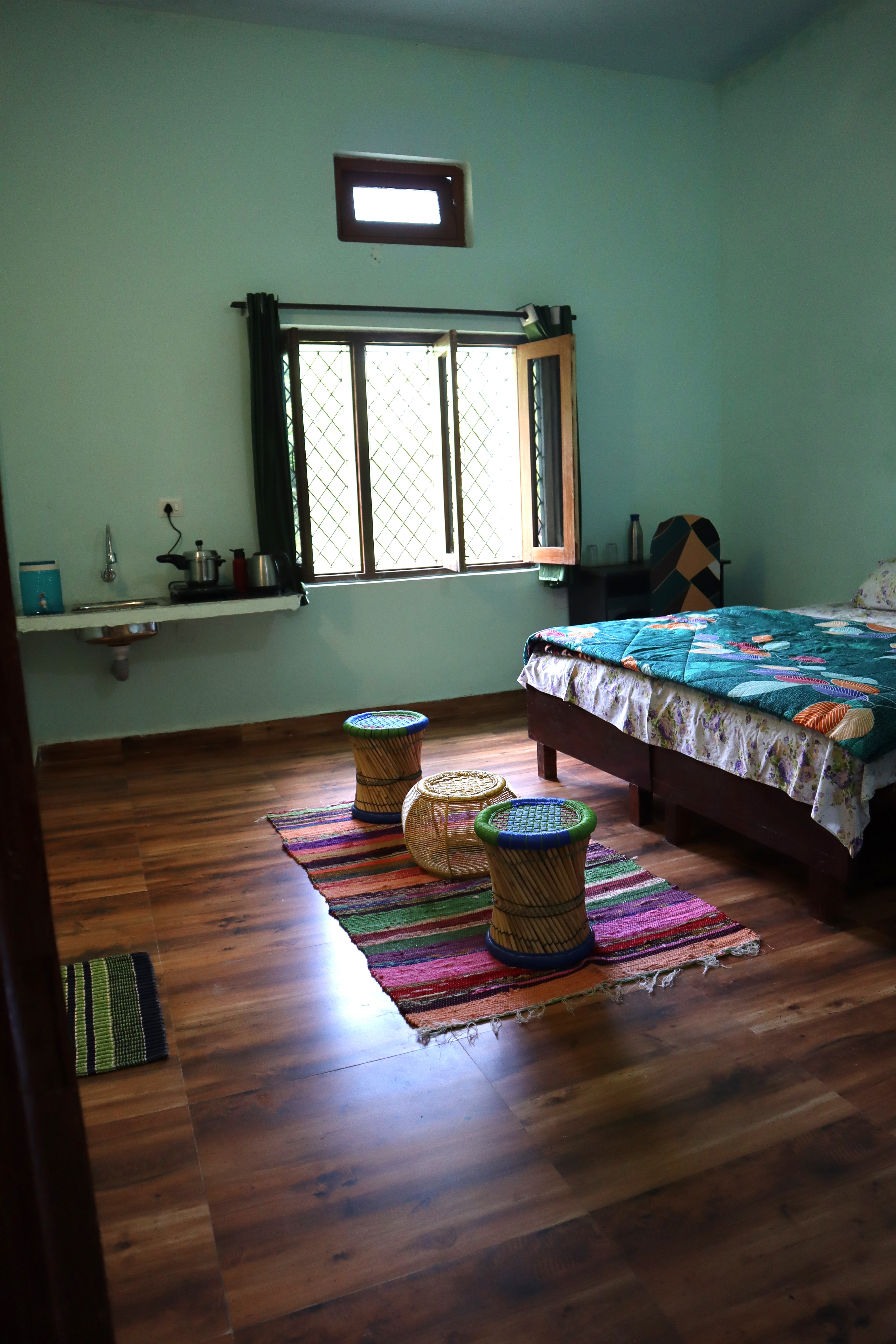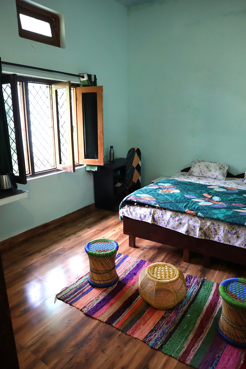 Welcome to the Minty Fresh Room – a green retreat that’s cozy, bright, and full of zest! Along with a double bed, fresh linen, pillows, chairs, table, almirah, lamp, and work desk, it features a private washroom with geyser and its own mini kitchen setup with induction, utensils, and sink so you can whip up meals anytime. Open your windows to refreshing mountain, and lawn views, making every moment feel fresh, homely, and rejuvenating.
