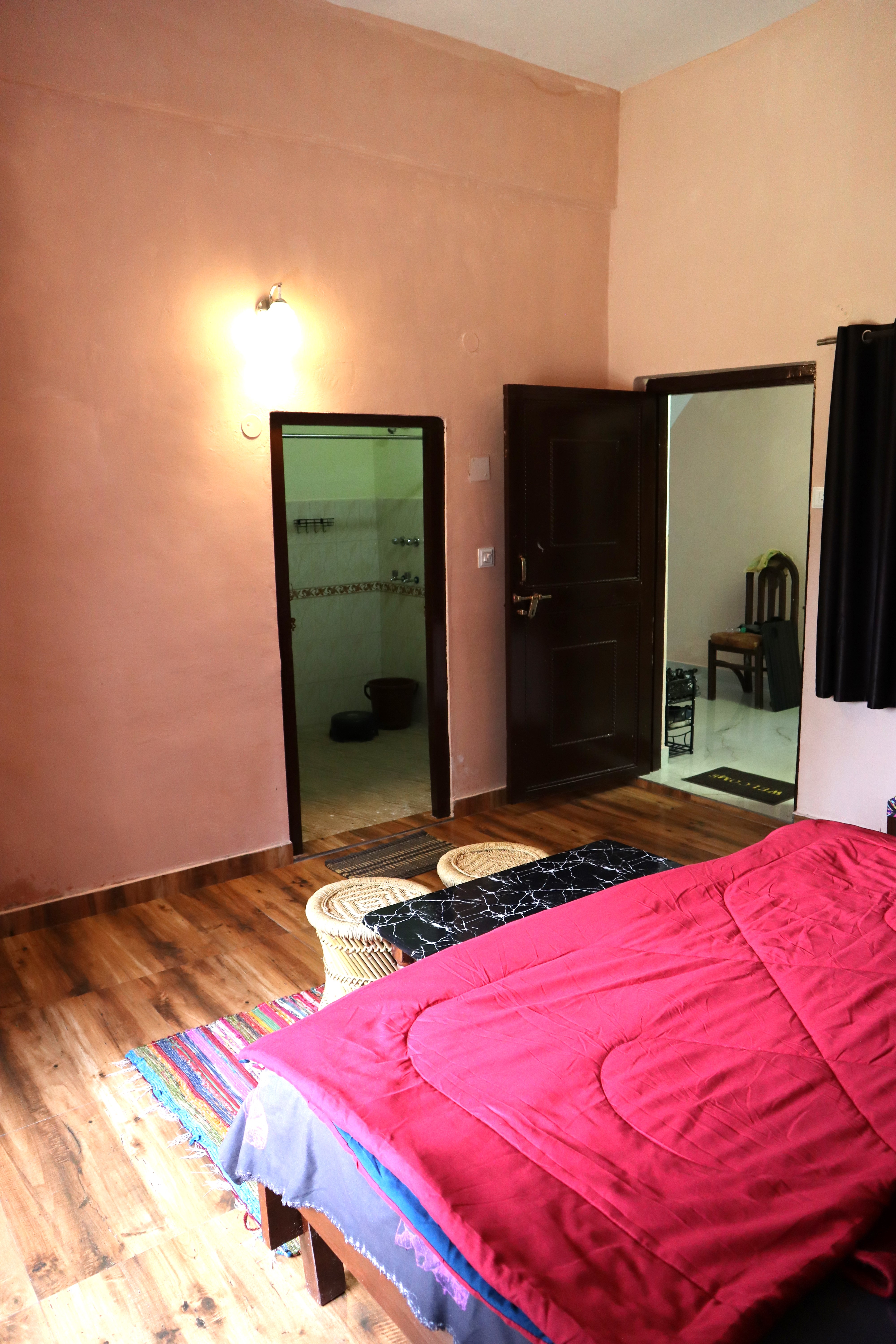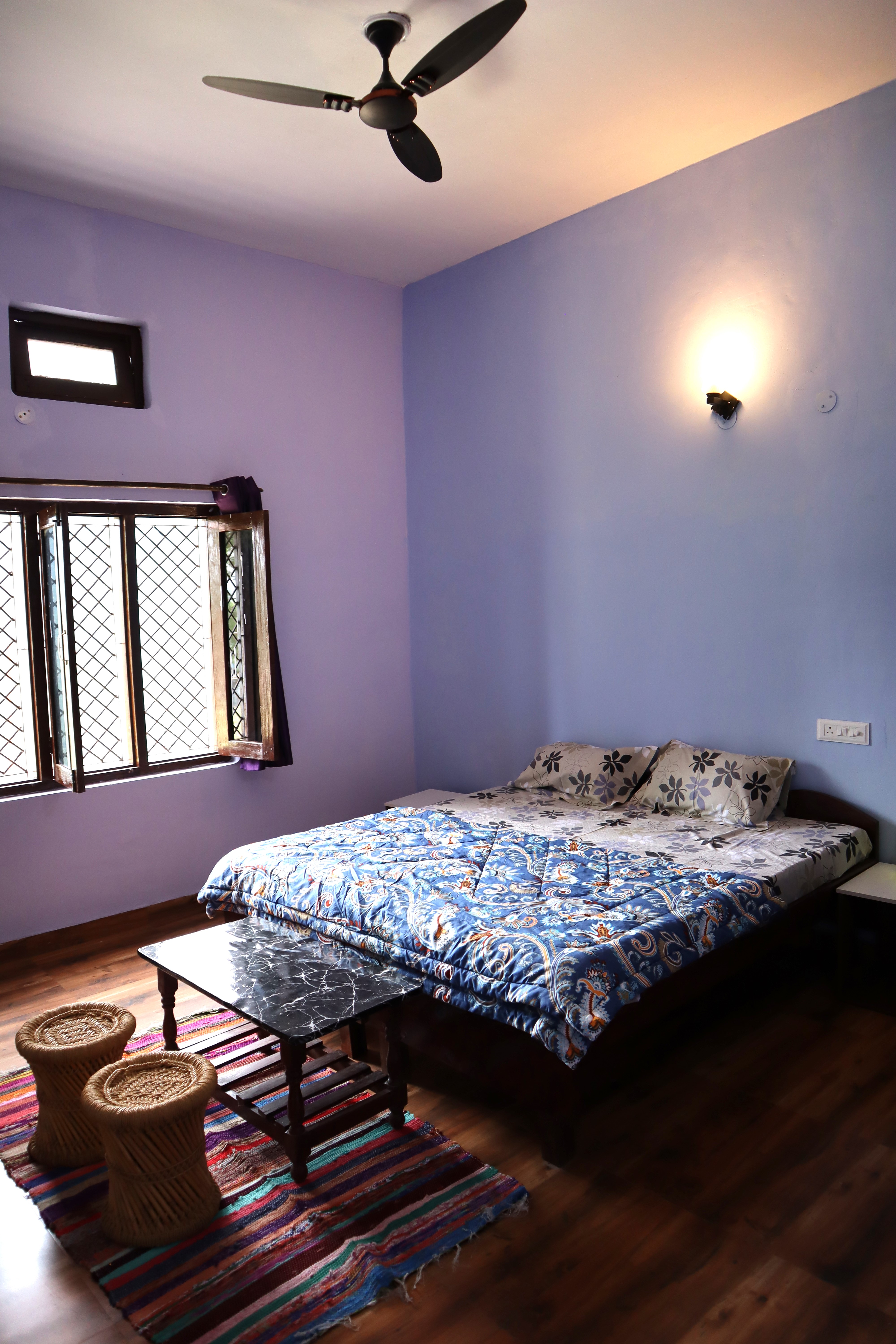 Step into the Groovy Grape Room – a purple-toned haven that’s as vibrant as it is relaxing! Enjoy a double bed with fresh linen, pillows, chairs, table, almirah, lamp, and a dedicated work desk for work or journaling. Your private washroom with geyser adds ease to your stay. Open the window to soak in majestic mountains, flowing river, and lush valley views – perfect for a groovy getaway filled with color, calm, and a dash of fun!