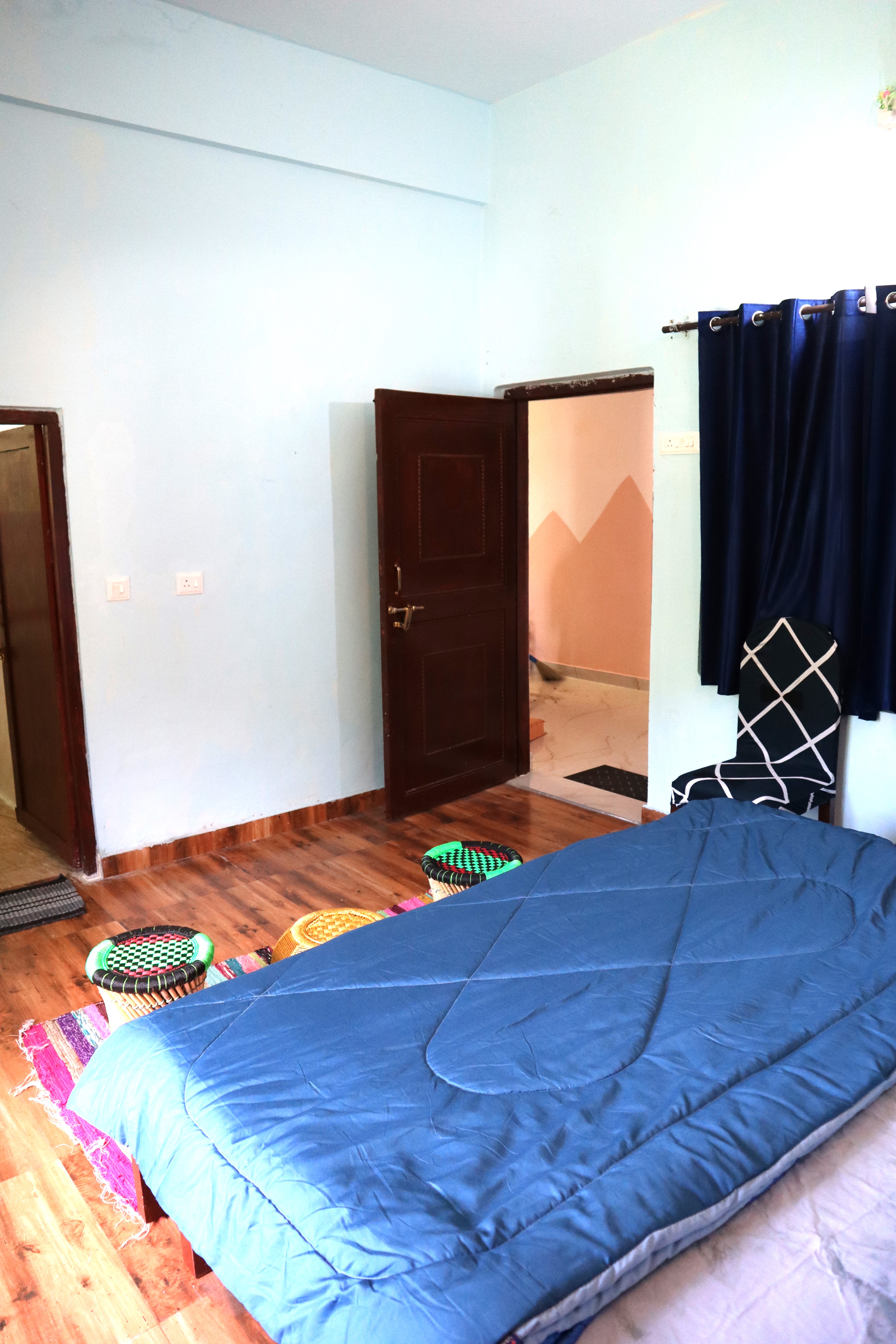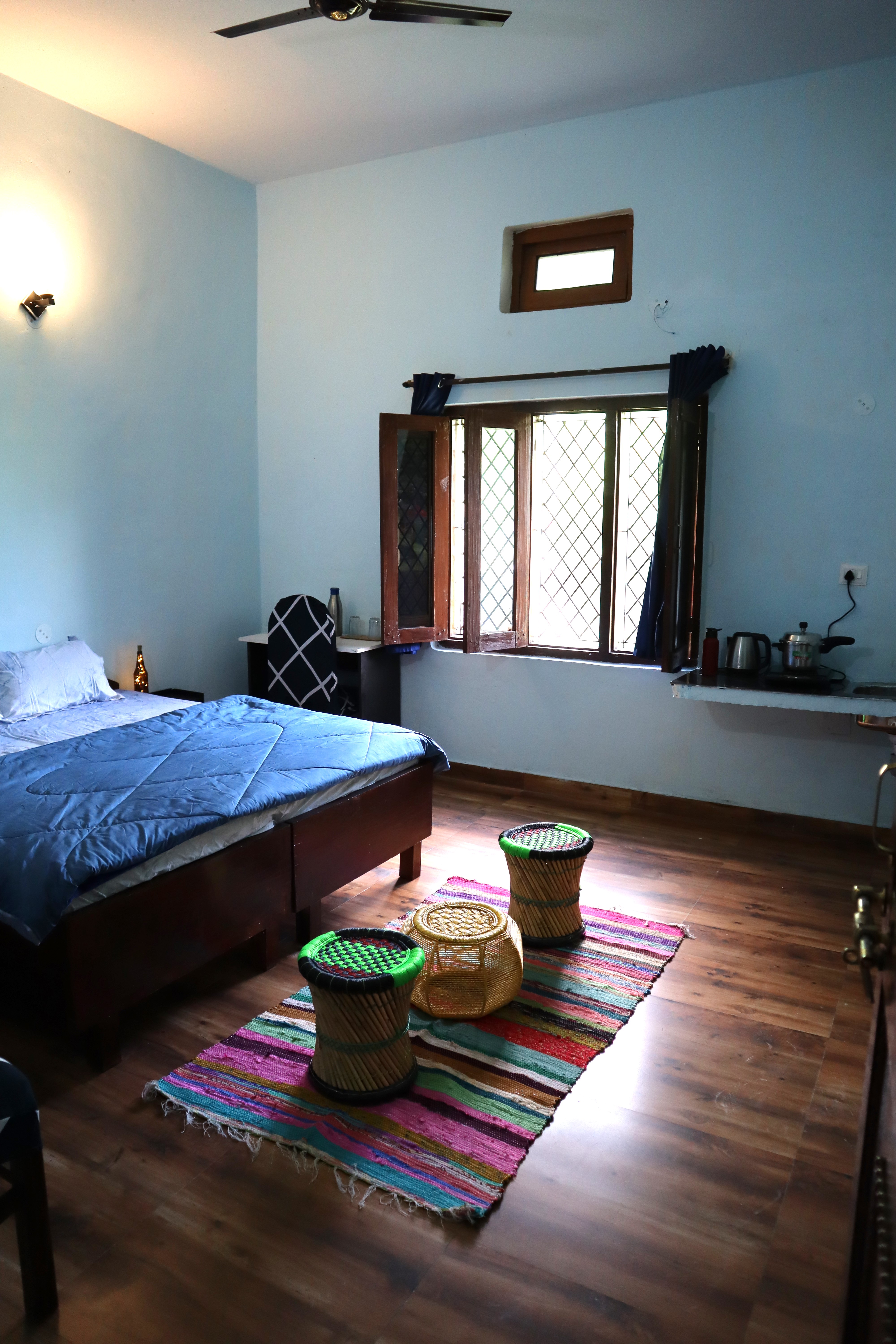 Step into the Blueberry Bliss Room, where calm blue tones meet homely comfort. This room offers a double bed with fresh linen, pillows, chairs, table, lamp, almirah, and dedicated work desk, along with a private washroom and geyser. For added convenience, it comes with a mini kitchen setup with induction, utensils, and sink, perfect for self-cooking. Large windows open to serene mountain and lawn views, filling your stay with peace and a hint of blissful charm.