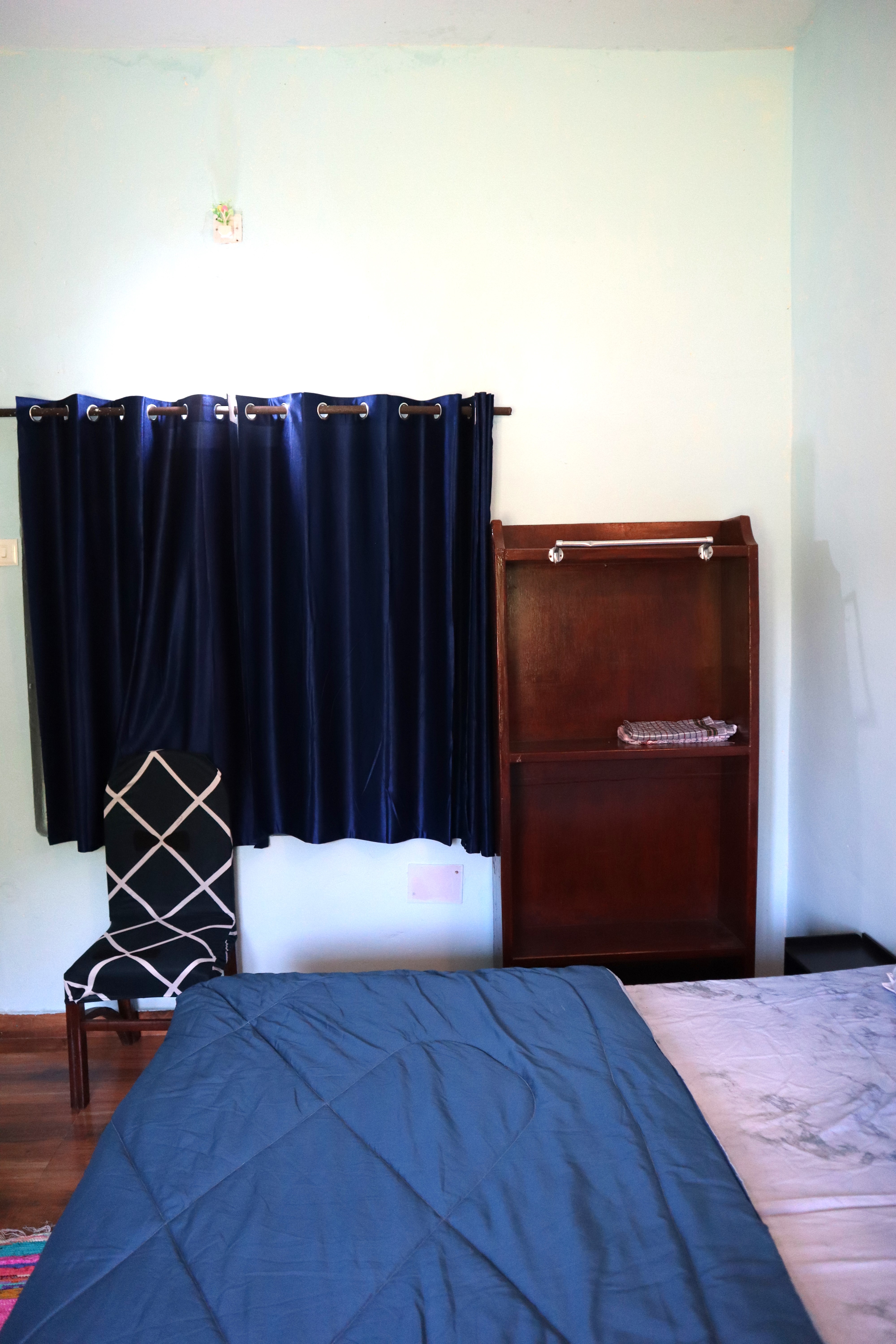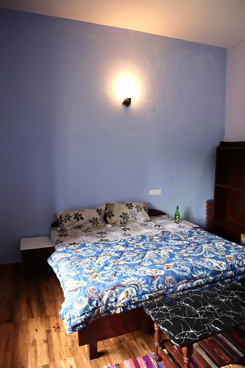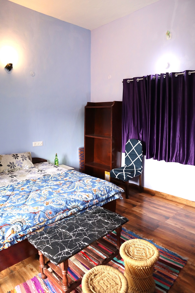 Step into the Blueberry Bliss Room, where calm blue tones meet homely comfort. This room offers a double bed with fresh linen, pillows, chairs, table, lamp, almirah, and dedicated work desk, along with a private washroom and geyser. For added convenience, it comes with a mini kitchen setup with induction, utensils, and sink, perfect for self-cooking. Large windows open to serene mountain and lawn views, filling your stay with peace and a hint of blissful charm.