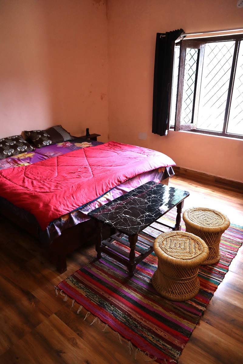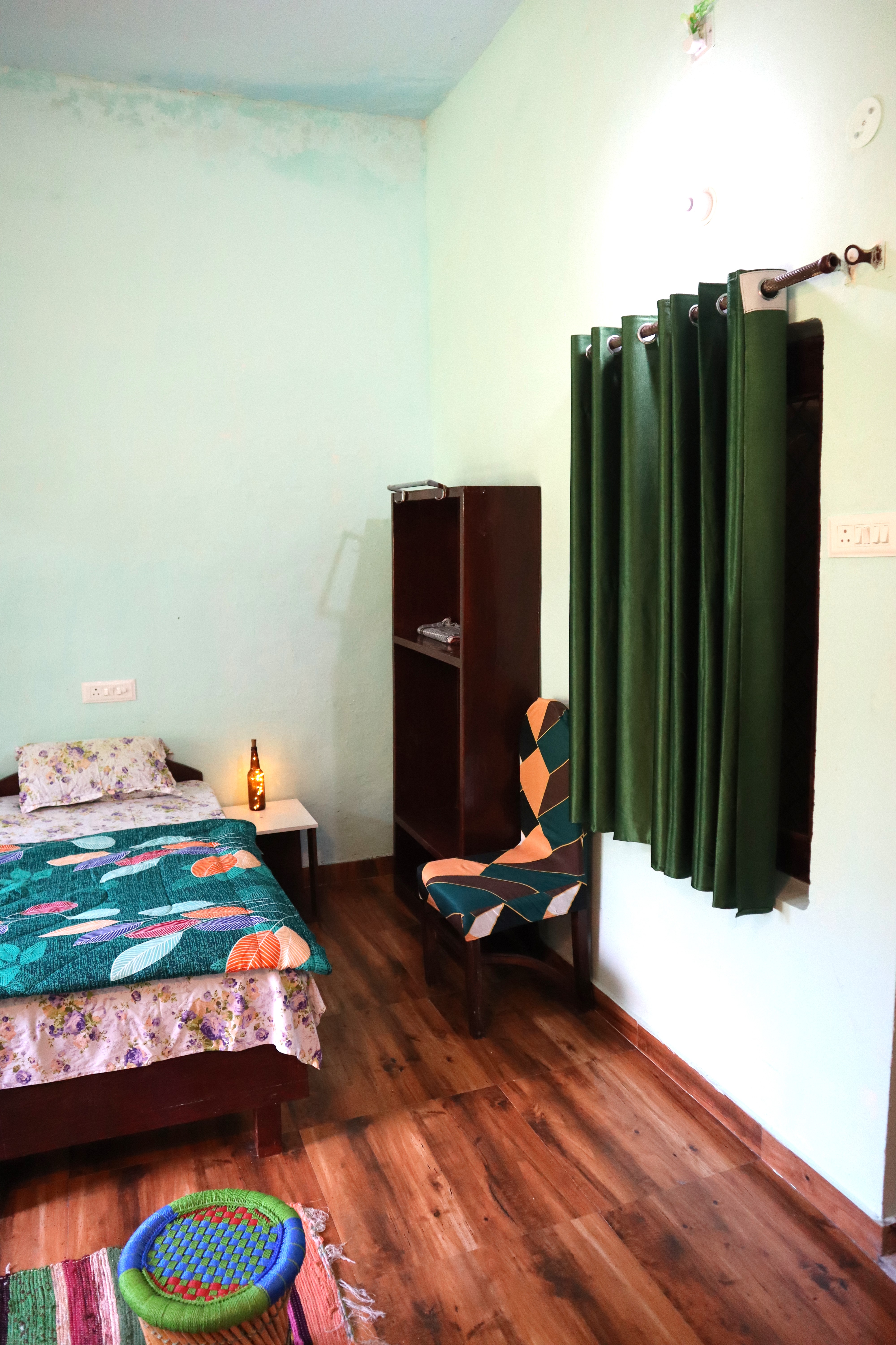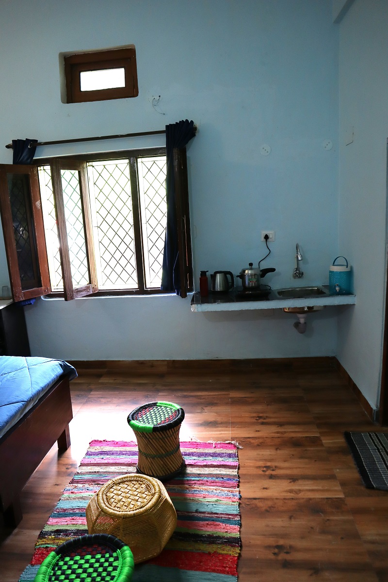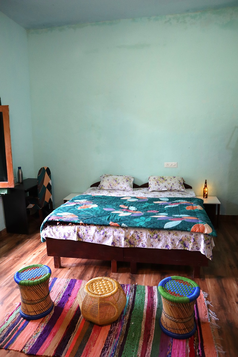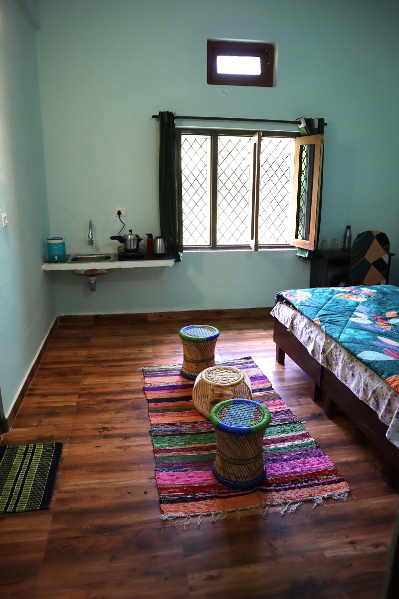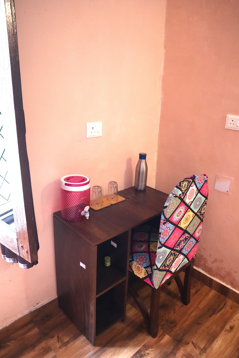 Welcome to the Minty Fresh Room – a green retreat that’s cozy, bright, and full of zest! Along with a double bed, fresh linen, pillows, chairs, table, almirah, lamp, and work desk, it features a private washroom with geyser and its own mini kitchen setup with induction, utensils, and sink so you can whip up meals anytime. Open your windows to refreshing mountain, and lawn views, making every moment feel fresh, homely, and rejuvenating.