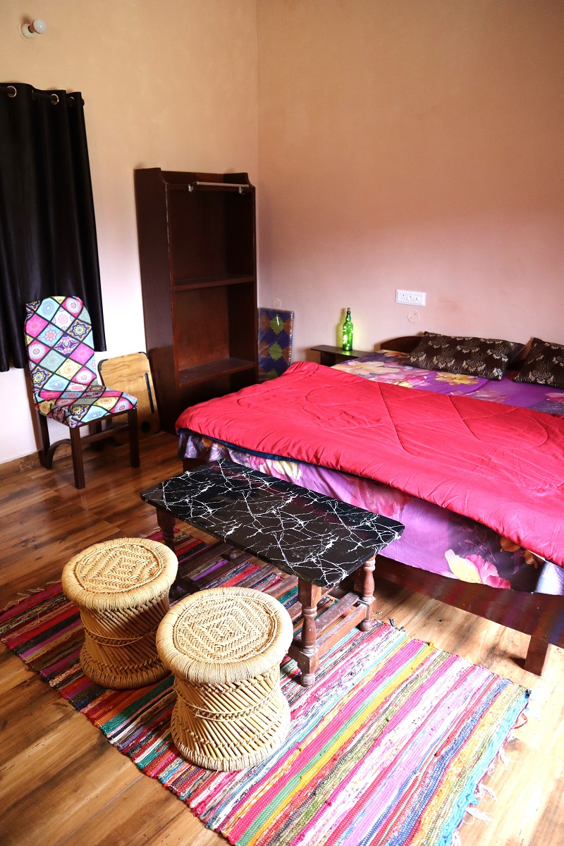 Welcome to the Choco Loco Room – where cozy meets a little crazy! Wrapped in warm brown tones, this snug escape has a double bed with fresh linen, pillows, chairs, table, almirah, lamp, and a dedicated work desk. Your private washroom with geyser keeps things comfy. Best part? The window opens to mountain, valley, and river views – a treat for dreamers, workers, and chocolate-soul wanderers alike!
