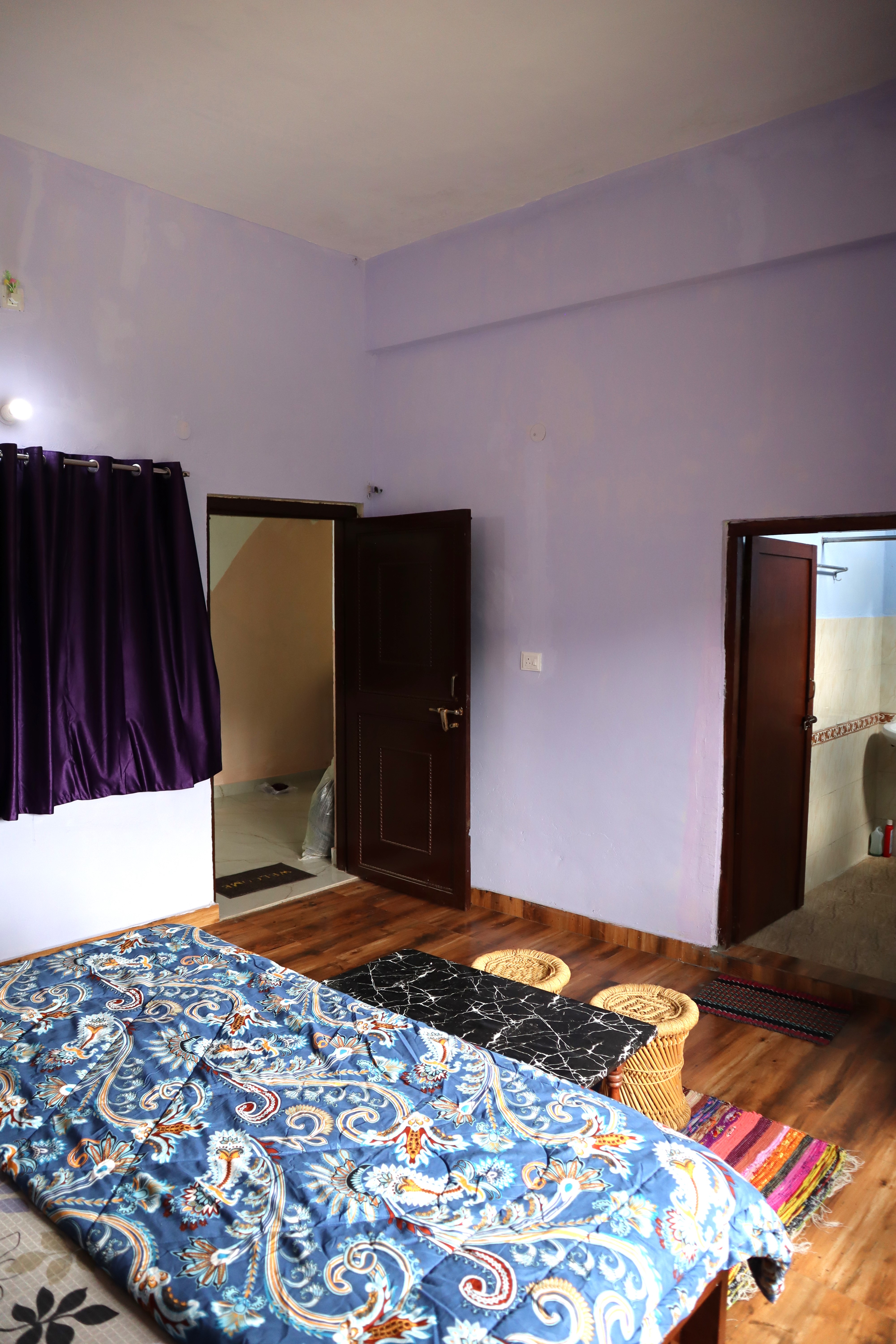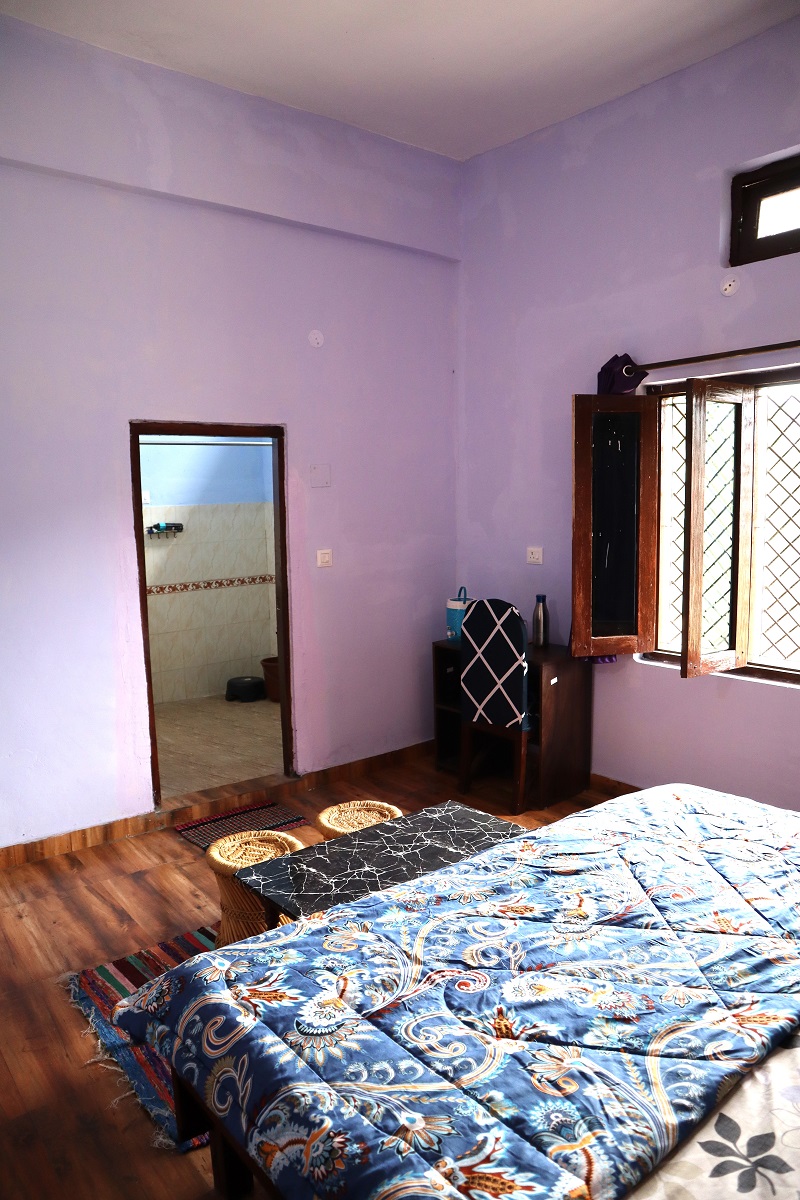 Step into the Groovy Grape Room – a purple-toned haven that’s as vibrant as it is relaxing! Enjoy a double bed with fresh linen, pillows, chairs, table, almirah, lamp, and a dedicated work desk for work or journaling. Your private washroom with geyser adds ease to your stay. Open the window to soak in majestic mountains, flowing river, and lush valley views – perfect for a groovy getaway filled with color, calm, and a dash of fun!